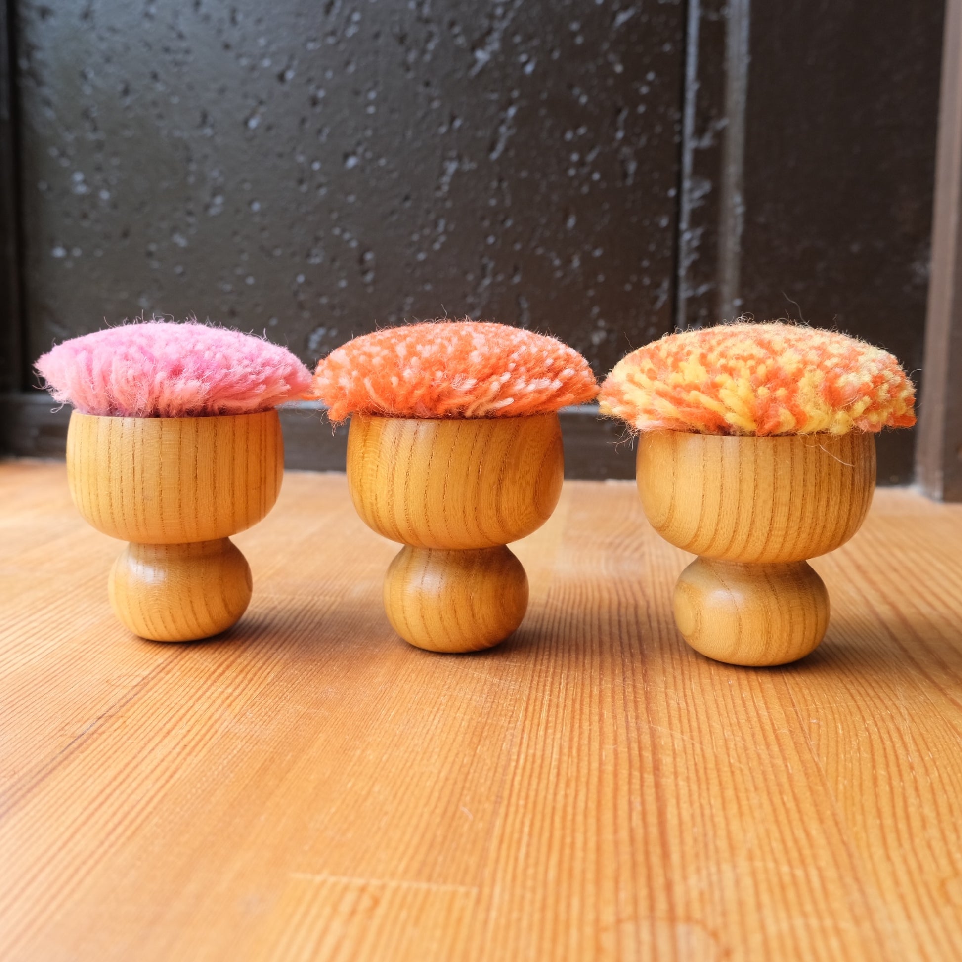 山形県の南、米沢市にある緞通(だんつう ※じゅうたんの一種)の工房で作られた革用ウールブラシ「べにばな」。カラフルなウール糸を使った緞通とろくろ挽きの木製持ち手で作られた柔らかいブラシです。