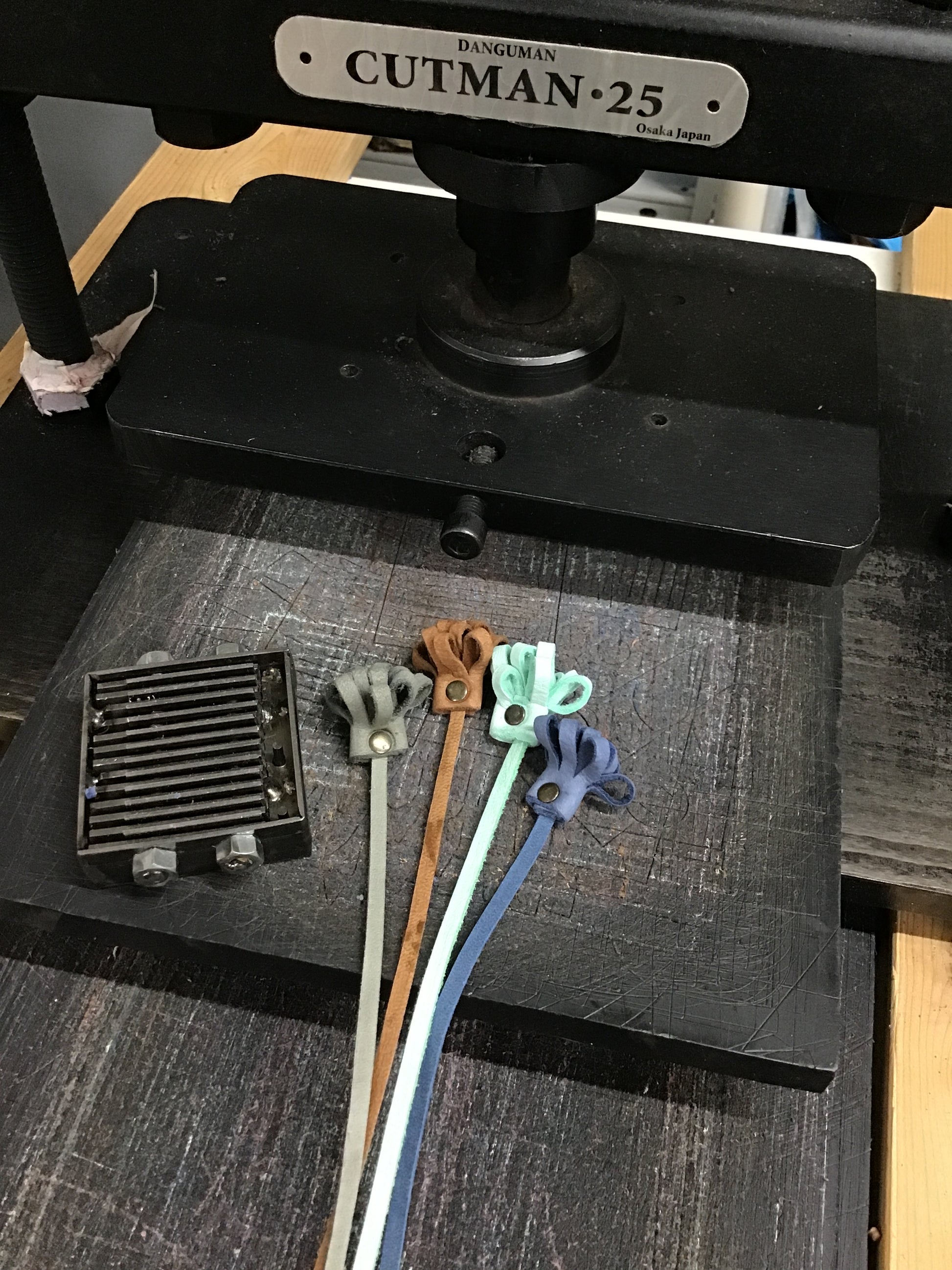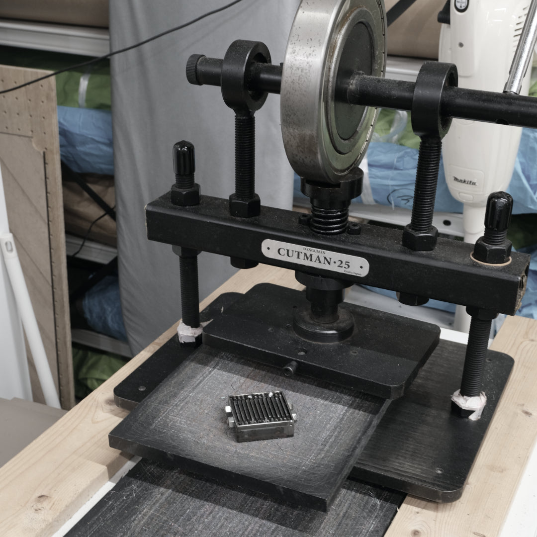 2. 小型の裁断機と型を使って鹿革を形に抜く